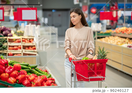 Young adult woman wearing casual outfit walking along aisles with shopping cart choosing things to buy in modern store