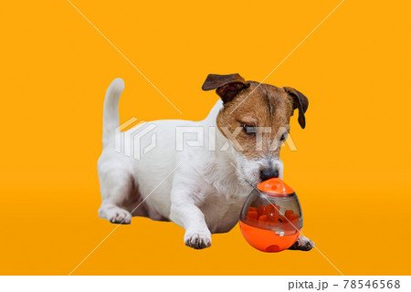 Pet enrichment concept with a dog playing with an egg-shaped sniffing toy