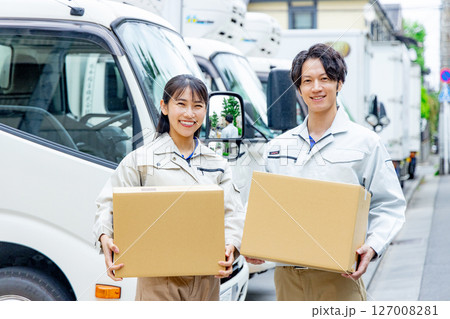 搬家公司正在進行搬遷工作,卡車正在住宅區進行配送。