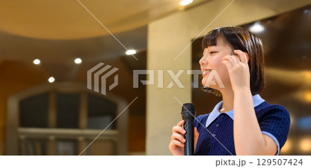 Side view close up of studio microphone on stand with African American girl speaking and recording podcast, copy space