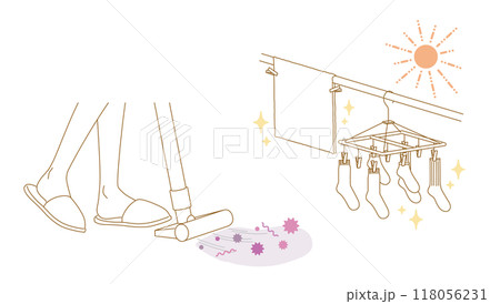 腳氣預防插圖集:清潔地板、清洗、乾燥和消毒