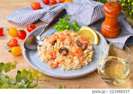 蝦子抓飯,蝦子抓飯,海鮮菜餚,抓飯,蘑菇,檸檬,午餐,西餐,酒