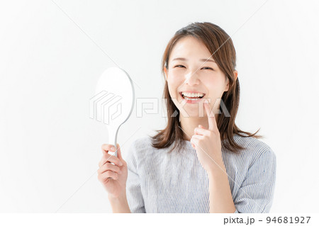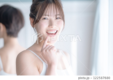 年輕女子指著她的嘴巴/牙齒 牙科護理