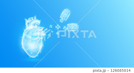 Medical sign symbol blue cross floats out capsule absorbs into the heart. Emergency medicine first aid and health care innovation treatment. Human heart organ translucent low poly triangles. Vector.