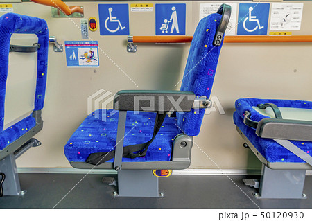 Interior of a military mobile canteen bus for soldiers, cook workplace, seats and tables.