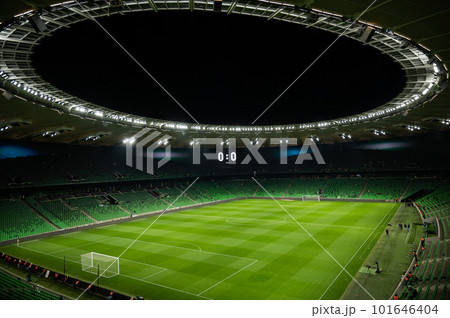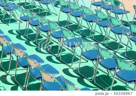 There are many outdoor light chairs in front of the amphitheater stage on the street for mass events and concerts
