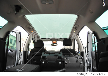 Well-groomed and clean car interior, gray fabric seats, folded seats.