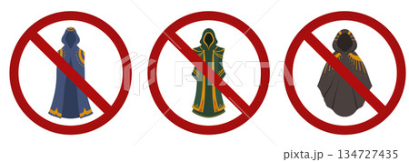 Vector set of prohibition signs with black silhouette of clothing. No capes allowed. No anonymity allowed. No entry for magicians.