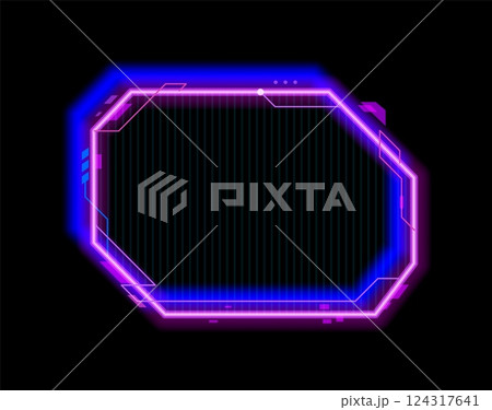 Mobile game electronic neon UI menu frame. SCI FI arcade futuristic HUD design border, computer gaming vector digital led blue and violet light UI menu design element. Game neon glow interface overlay