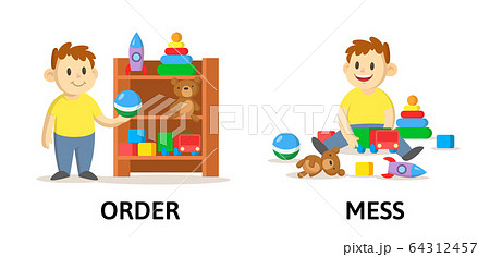 Words order and mess flashcard with cartoon characters. Opposite adjectives explanation card. Flat vector illustration, isolated on white background.