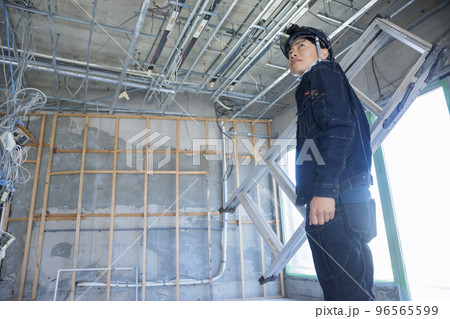 一名穿著時尚牛仔工作服在建築工地工作的工人