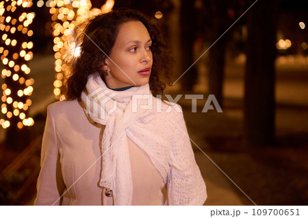 Multi ethnic beautiful young woman in warm beige coat, walking at night in the street with Christmas lights on backdrop