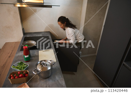 High angle view of a housewife cooking dinner at home kitchen.