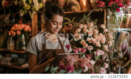 Caucasian woman using tablet in flower shop.