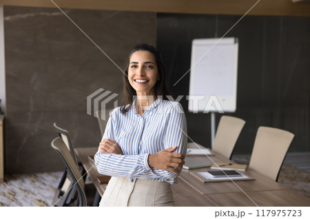 Cheerful beautiful Latin business leader, executive woman posing in office