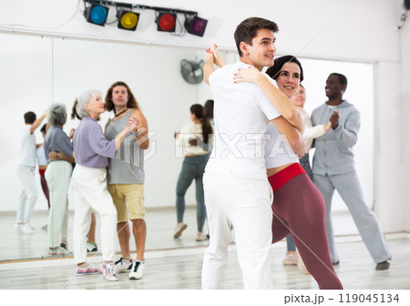 Pairs practicing Latino dance in training hall during dancing-classes. Pairs training ballroom dance