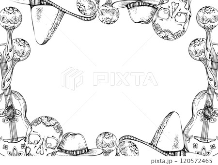Mexican symbols sombrero hat, guitar maracas mariachi musical instruments, floral ornament. Hand drawn ink vector isolated illustration card border frame. Design travel vacation, folk concert brochure