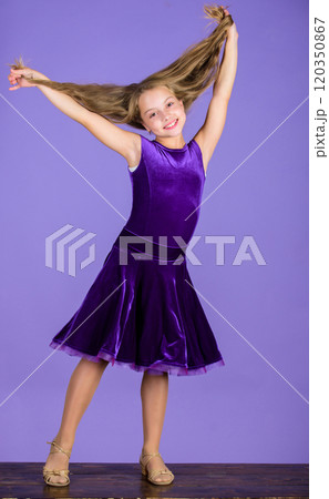 Hairstyle for dancer. How to make tidy hairstyle for kid. Things you need know about ballroom dance hairstyle. Ballroom latin dance hairstyles. Kid girl with long hair wear dress on violet background