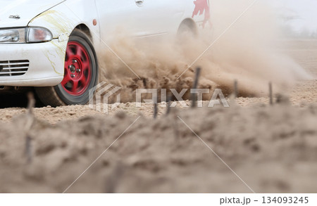 Rally Car on a Turn and a Cloud of Dust in the Sunlight