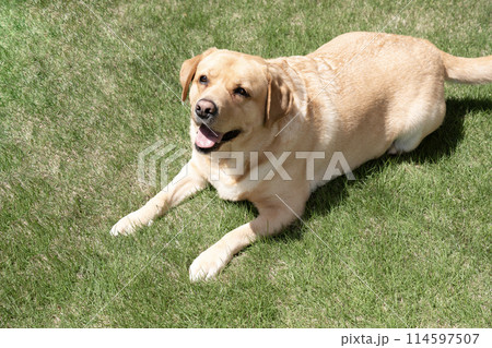 拉布拉多獵犬在草坪上微笑