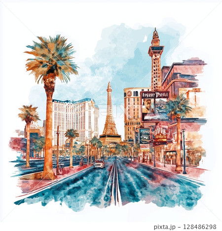 Las Vegas Strip. Las Vegas Strip hand drawn watercolor illustration