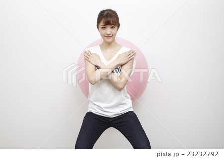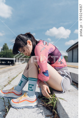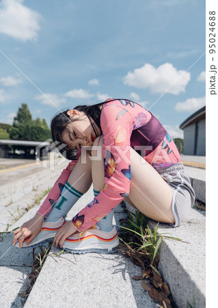 In the morning, an Asian woman is doing yoga,sitting forward bend exercise, head to knees, uttanasana stance, working out, and wearing sportswear.