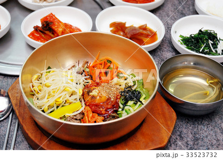 Korean-style lunch box with bibimbap ingredients, kimchi and pickled radish. Container with dosirak.