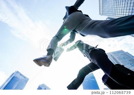 充滿活力和活力的商人與兩人一起飛翔和跳躍,飛向大城市的藍天