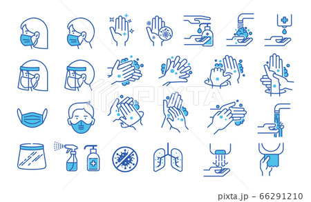 Set of hand washing icons in thin line style. Hygiene icons. The icons as hand wash, soap, alcohol, detergent, anti bacterial and mask. Vector illustrations.