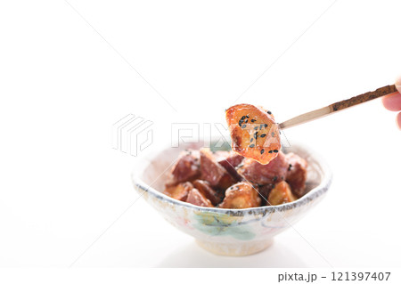 大學院用湯匙將醬汁淋在地瓜上 拌勻醬汁 撒上黑芝麻