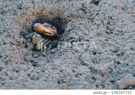 Fiddler Crab Emerging from Mud Burrow at Low Tide
