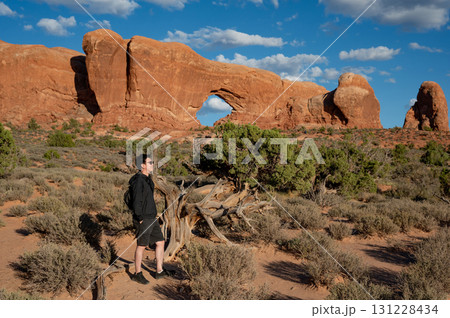 Asian male tourist standing at North Window in Arches National Park, Utah, USA