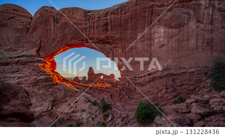 Turret arch through the North Window during sunset in Arches National Park, Utah, USA