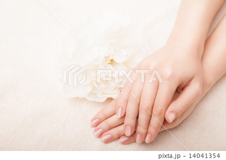 pretty perfect woman hands with white manicure and little flowers on colorful background