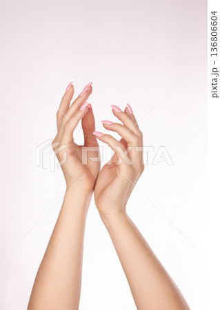 Soft Pink Manicured Hands Elegantly Raised Showcasing Slender Fingers Glossy Oval Nails Smooth Skin Delicate Pose, Grace, Femininity Clean Pastel Beauty For Nail Care, Manicure, Nails Polish