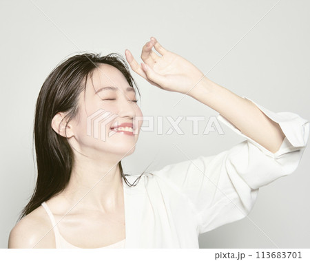 Beautiful Young Asian woman lifting hands up to show off clean and hygienic armpits or underarms
