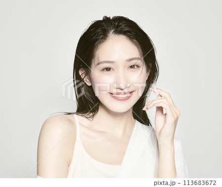Beautiful young asian woman with clean fresh skin on white background, Face care, Facial treatment,