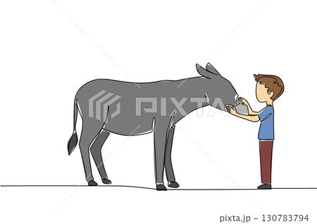 Single one line drawing the boy stands in front of the donkey and strokes its head. Playing at the zoo. Learning to love fellow creatures. World Donkey Day. Continuous line design graphic illustration