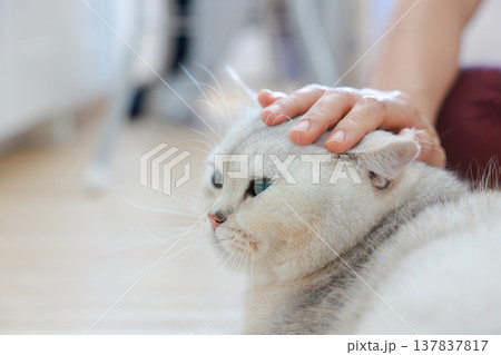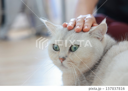Close up of a human hand gently petting a cute fluffy white British Shorthair cat with beautiful green eyes. Love, bonding and affection between pet owner and adorable feline companion at home.