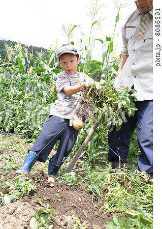 紅薯橫截面和微笑的日本男孩的秋季圖像插圖素材