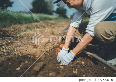 一名兒童(女孩)一邊拔藤蔓,一邊挖地瓜