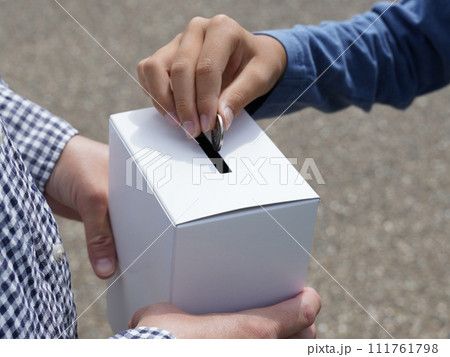 Volunteer woman provide clothing donation box with used clothes and doll to support help for refugee, homeless or poor people in the world.