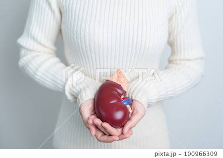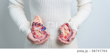 woman holding Anatomical human kidney Adrenal gland model. disease of Urinary system and Stones, Cancer, world kidney day, Chronic kidney and Organ Donor Day concept