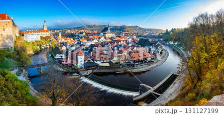 Panoramic view of Cesky Krumlov, showcasing the UNESCO-listed historic center surrounded by the Vltava River in a meander. A sunny autumn day highlights the town's charm.