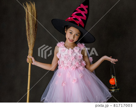 Portrait studio shot of little cute Asian kid in pink witch dress costume with black high hat stand smiling hold carved orange pumpkin face lamp and magic broomstick in Halloween traditional festival