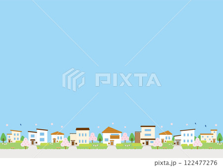春天風景與櫻花與音符(天空和草地)的插圖以橫向格式橫向書寫