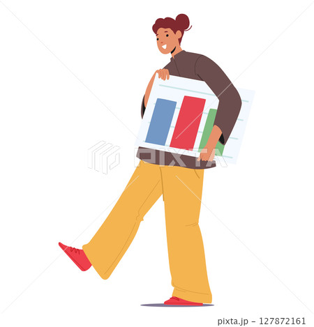 Businesswoman cartoon character with financial plan or investment profit analysis report in graphs