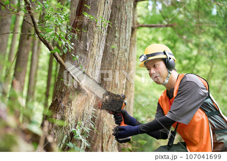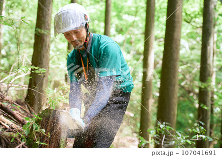 一名男性林業工人查看間伐後的森林並確認他的工作成果。