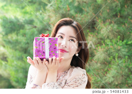 拿著紫色禮物盒的婦女在森林裡用兩隻手