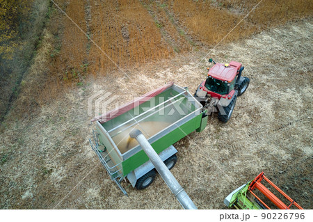 Aerial view of combine harvester unloading grain in cargo trailer working during harvesting season on large ripe wheat field. Agriculture and transportation of raw farm products concept